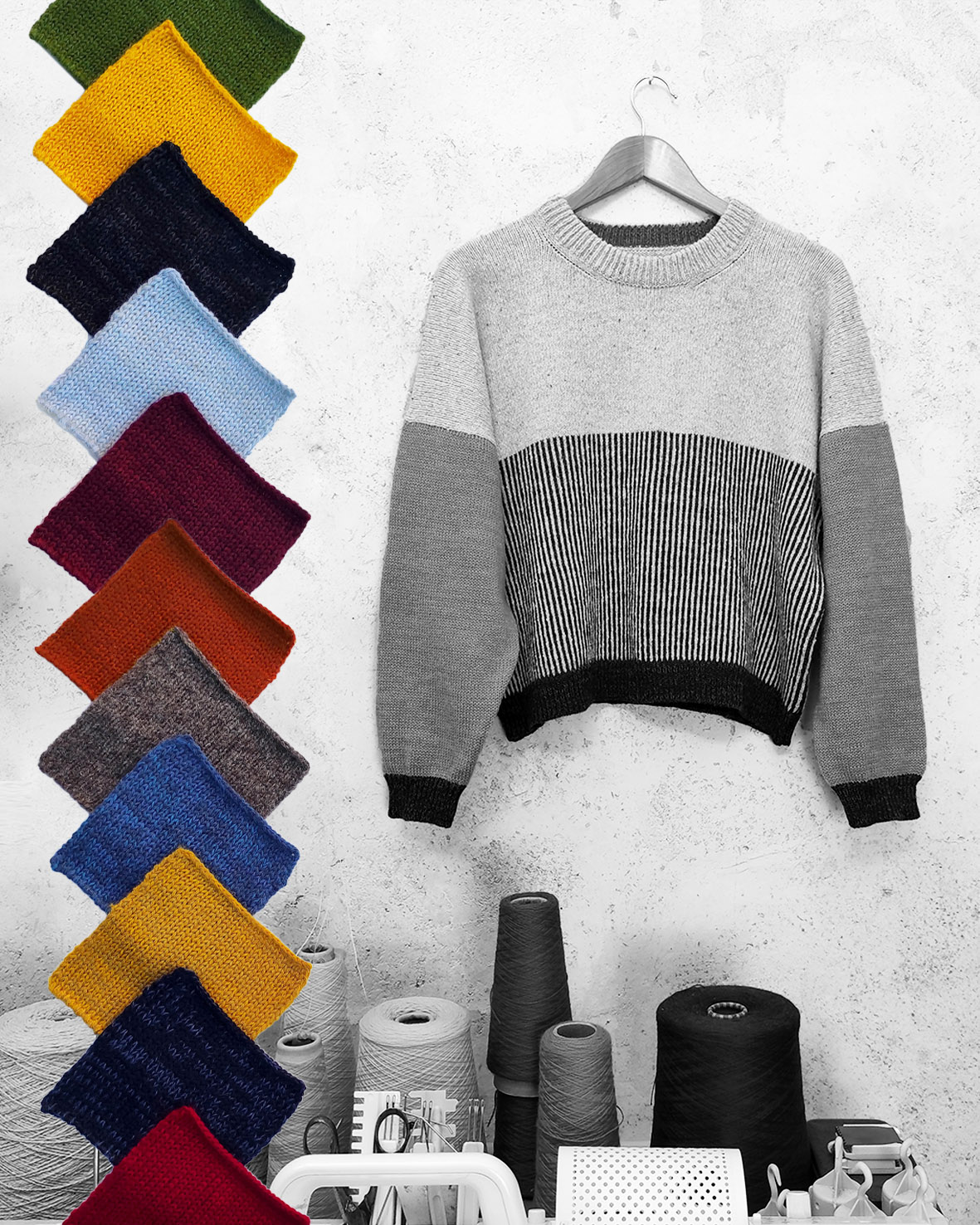 Choisissez des couleurs qui vous ressemblent, on tricote pour vous ! Pour personnaliser votre pull, rien de plus simple : sélectionnez les deux couleurs qui seront associées à la base en mérinos gris/beige.