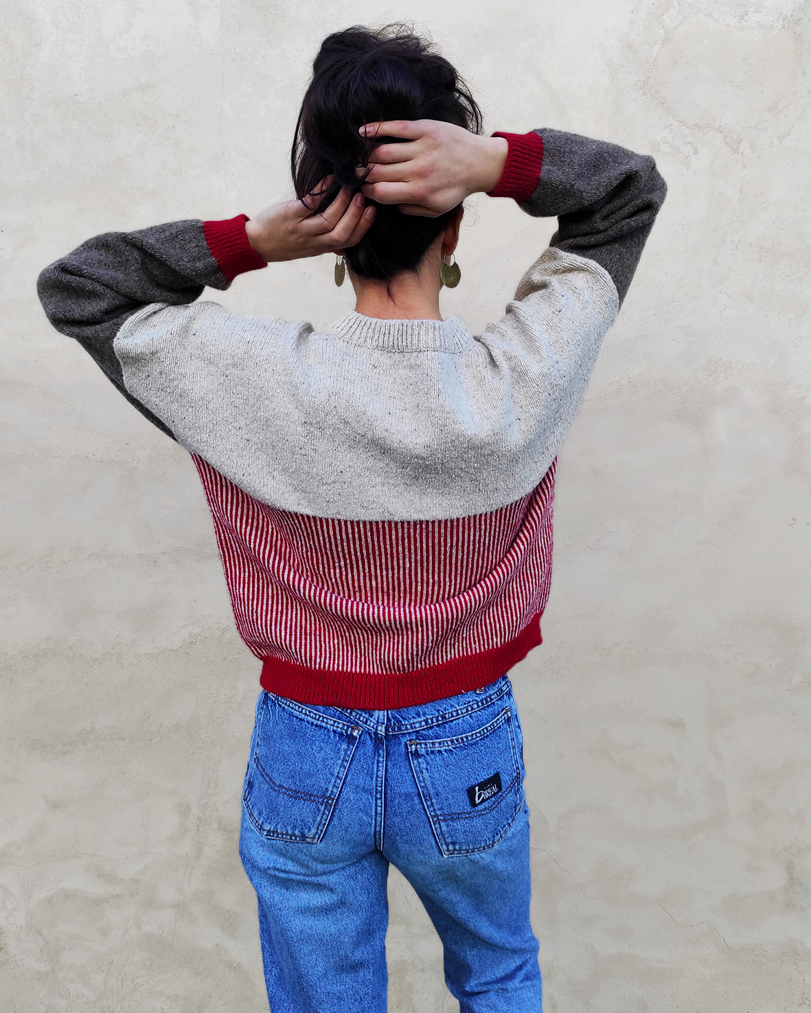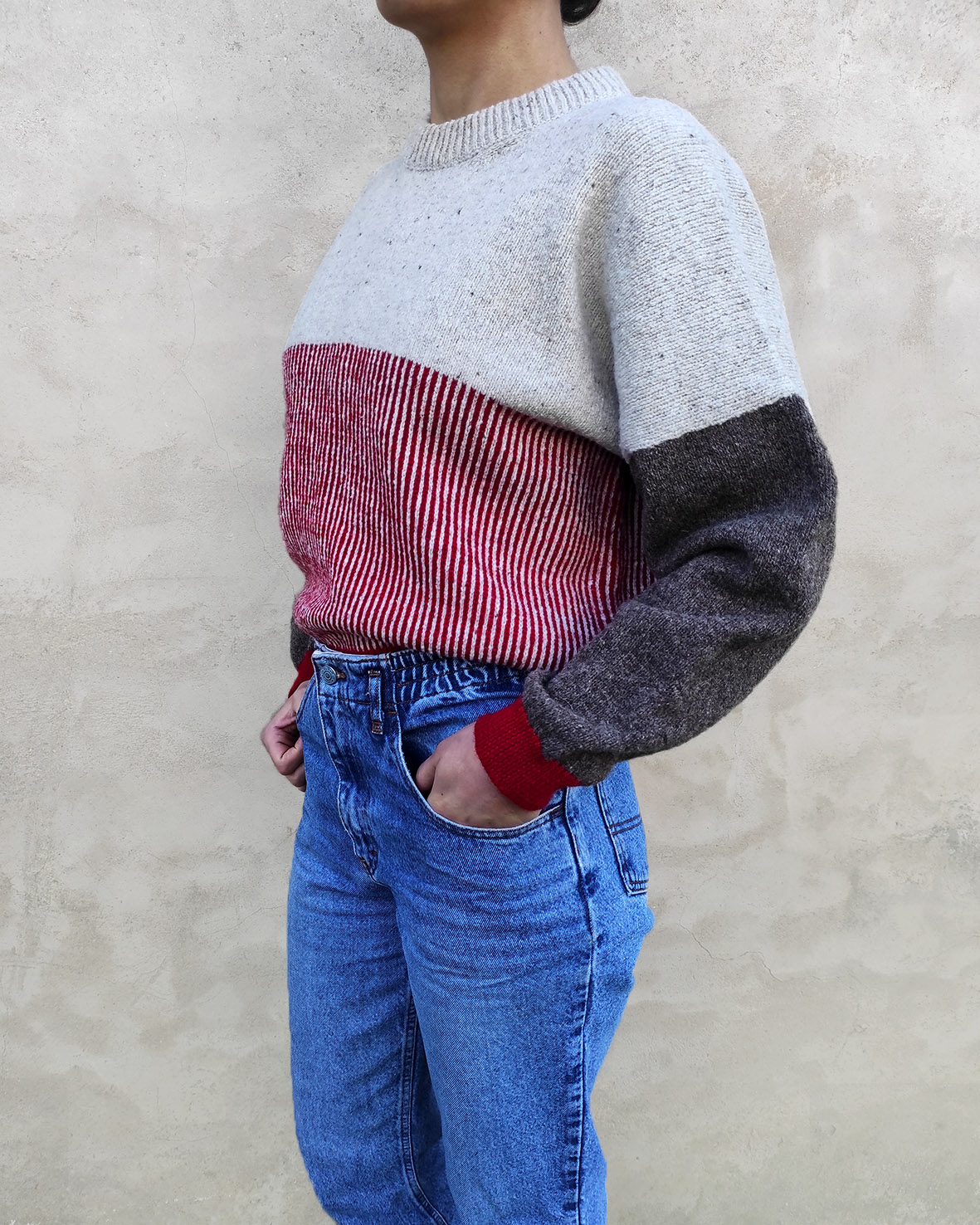 - Couleurs : rouge et marron/anthracite sur une base en mérinos de couleur naturelle gris/beige + Une couleur surprise à l’intérieur du col !