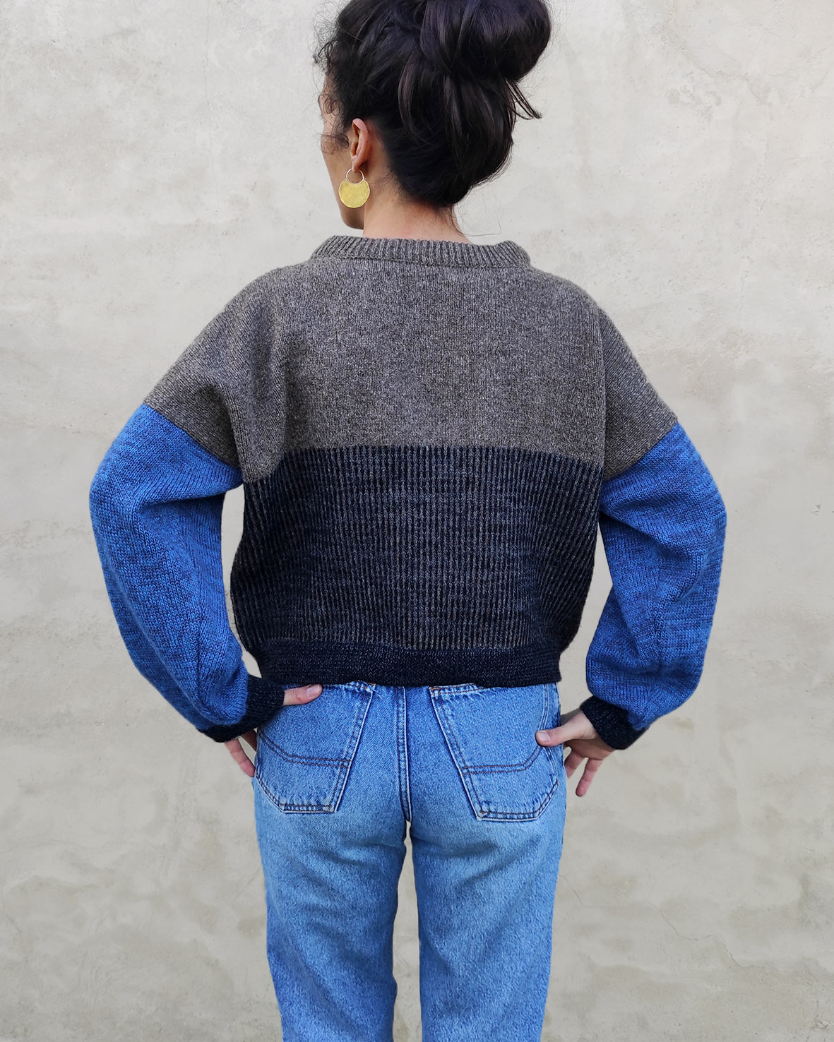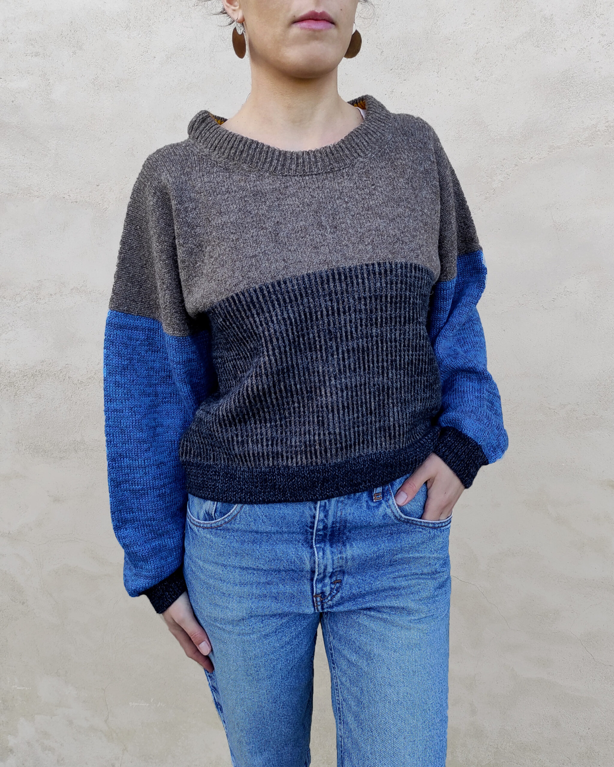 - Couleurs : bleu et noir sur une base en laine française de couleur naturelle marron/anthracite + Une couleur surprise à l’intérieur du col !